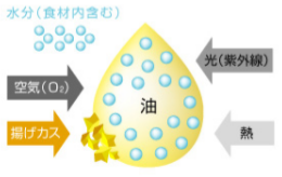 油の劣化原因油は水分、熱、光、空気などのエネルギーが加わり劣化します。劣化の主な原因は水分によるものと考えられます。 | 油の劣化抑制ヘルシーフライの電極板に電場が発生します。電極板を揚げ油中に設置して効果的に水分の蒸発を促進し油の品質を維持する事ができます。 |