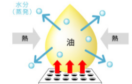 油の劣化原因油は水分、熱、光、空気などのエネルギーが加わり劣化します。劣化の主な原因は水分によるものと考えられます。 | 油の劣化抑制ヘルシーフライの電極板に電場が発生します。電極板を揚げ油中に設置して効果的に水分の蒸発を促進し油の品質を維持する事ができます。 |